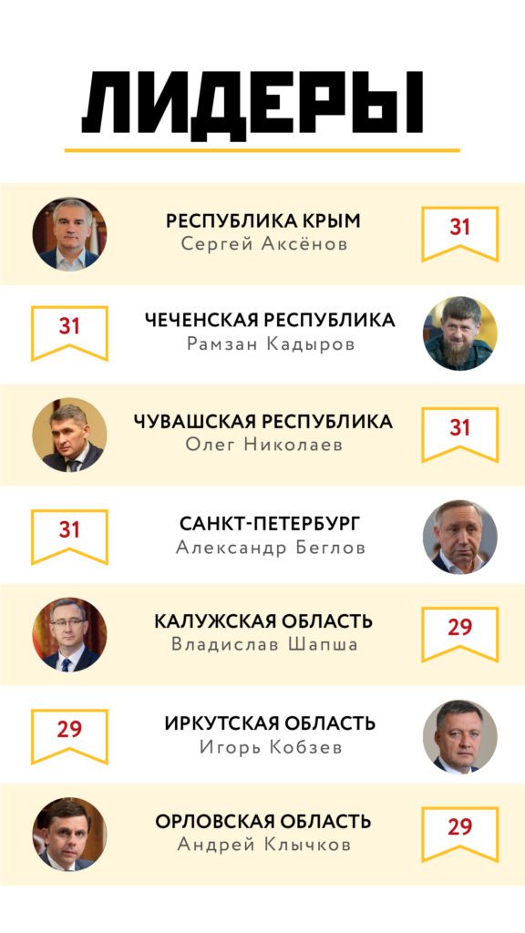 Аутсайдерами стали губернаторы Калининградской, Ленинградской, Новосибирской и Тверской областей, а замыкает список Смоленская область.
