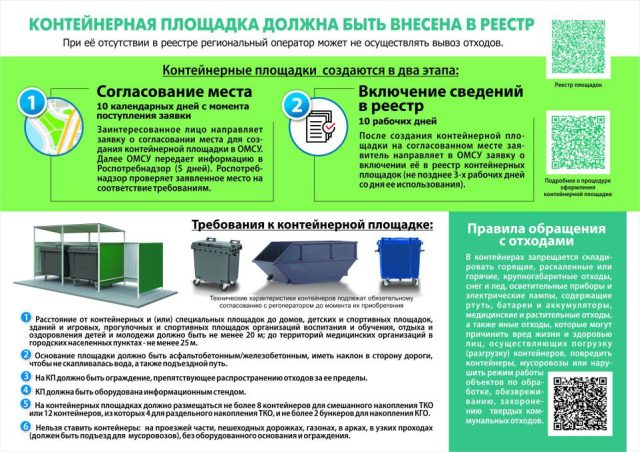 Подробный алгоритм действий для создания новой контейнерной площадки, а также требования к ним можно найти в инфографике, предоставленной региональным оператором.