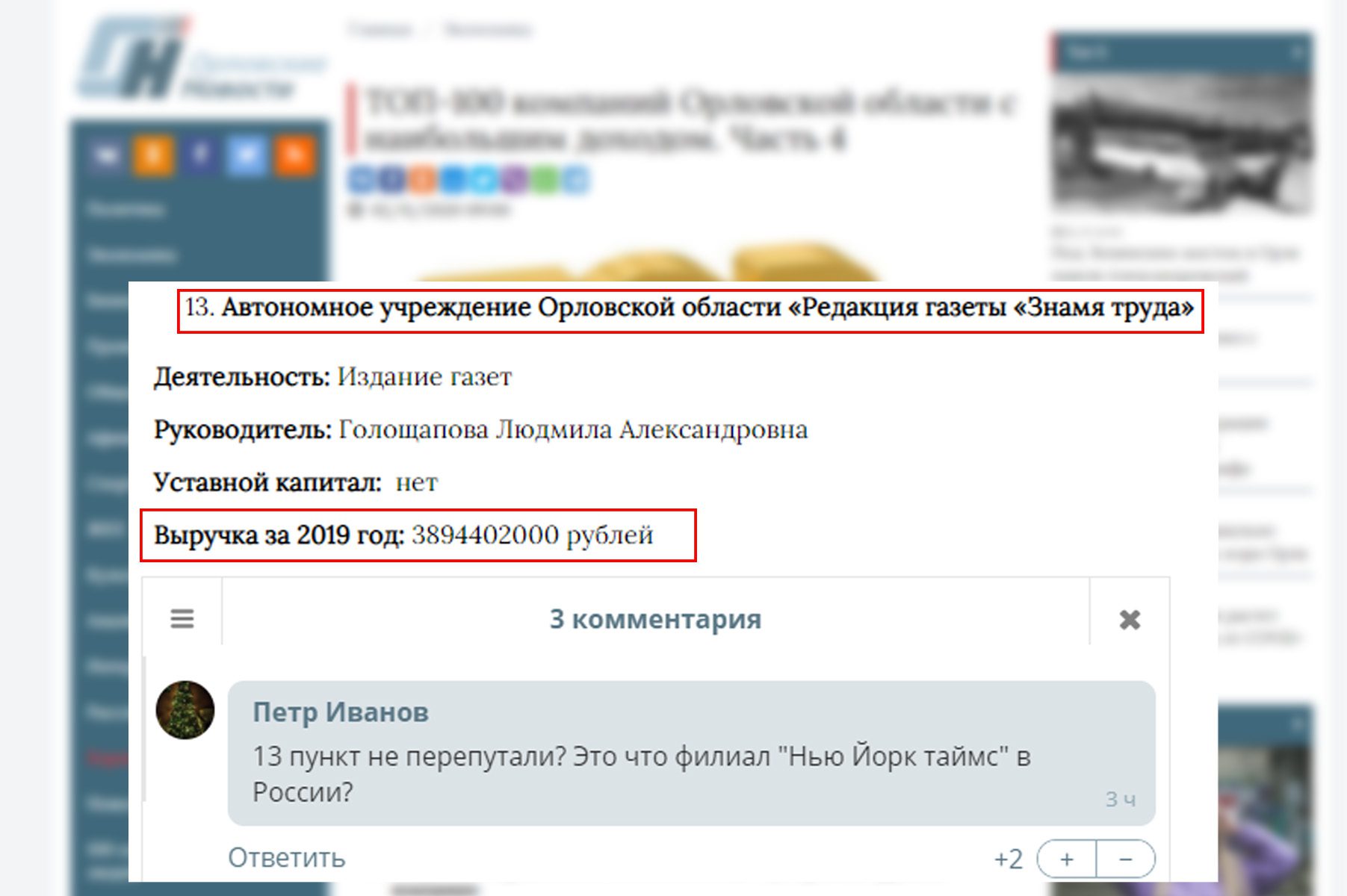 Накануне орловское СМИ опубликовало очередную часть ТОП-100 компаний области с наибольшим доходом за 2019 год. Все – знакомые лица: Корпорация ГРИНН, «КЕРАМА МАРАЦЦИ», «Газпром межрегионгаз Орёл»… И вдруг …редакция газеты «Знамя труда» из Должанского района. С опорой на данные портала Kartoteka.ru сообщалось, что районка за прошлый год заработала 3,8 млрд. рублей. Больше, чем Орёлстрой! Круче, чем у компании «Мираторг-Орел»!