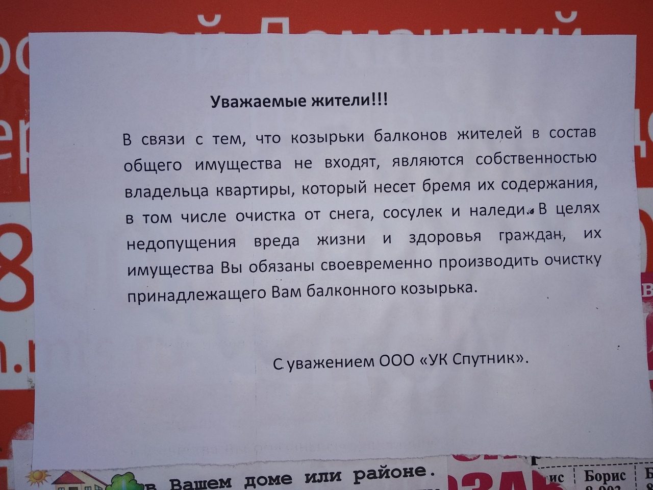 «В связи с тем, что козырьки балконов жителей в состав общего имущества не входят, являются собственностью владельца квартиры, который несет бремя их содержания, в том числе очистка от снега, сосулек и наледи. В целях недопущения вреда жизни и здоровья граждан, их имущества вы обязаны своевременно производить очистку принадлежащего вам балконного козырька», – гласит текст объявления управляющей компании.