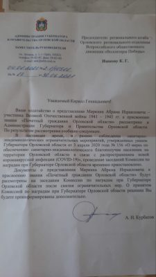 В 2021 году общественники инициировали обращение к губернатору с целью присвоить это почётное звание легендарному участнику Великой Отечественной Абраму Израилевичу Миркину. Председатель регионального штаба Орловского реготделения Всероссийского общественного движения «Волонтёры Победы» Кирилл Ишков получил официальный ответ от заместителя руководителя администрации губернатора и правительства Орловской области Алексея Курбатова. В нём чиновник отказывает волонтёрам, ссылаясь на коронавирус.