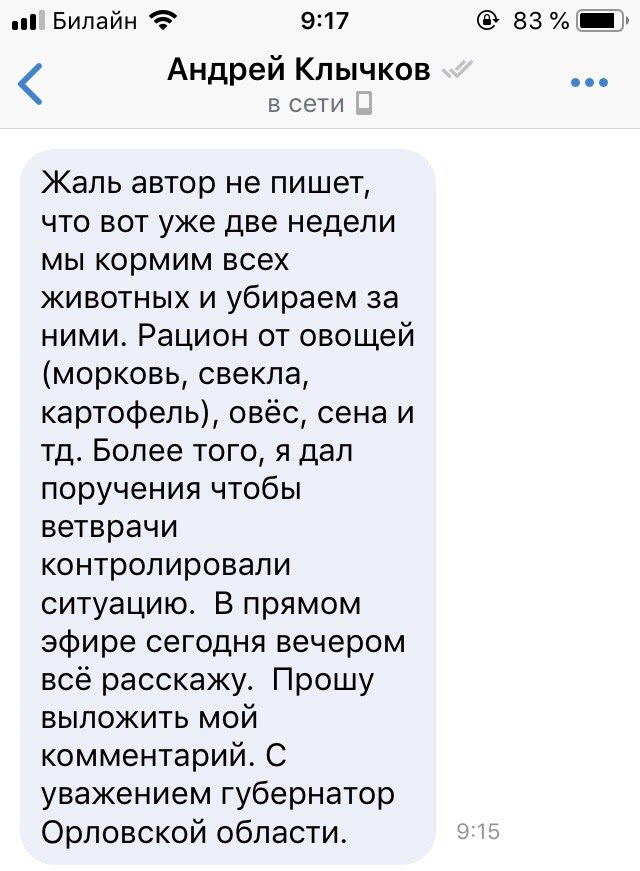 «Жаль автор не пишет, что мы вот уже две недели мы кормим всех животных и убираем за ними. Рацион от овощей (морковь, свёкла, картофель), овёс, сена и тд.», – написал Андрей Клычков, предупредив, что все подробности он расскажет в вечернем эфире.