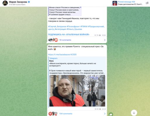«Мне кажется, это премия Рунета — специальный приз «За всё!»», — отметила дипломат в своём официальном телеграмм-канале», сопроводив запись смеющимся до слёз смайликом.