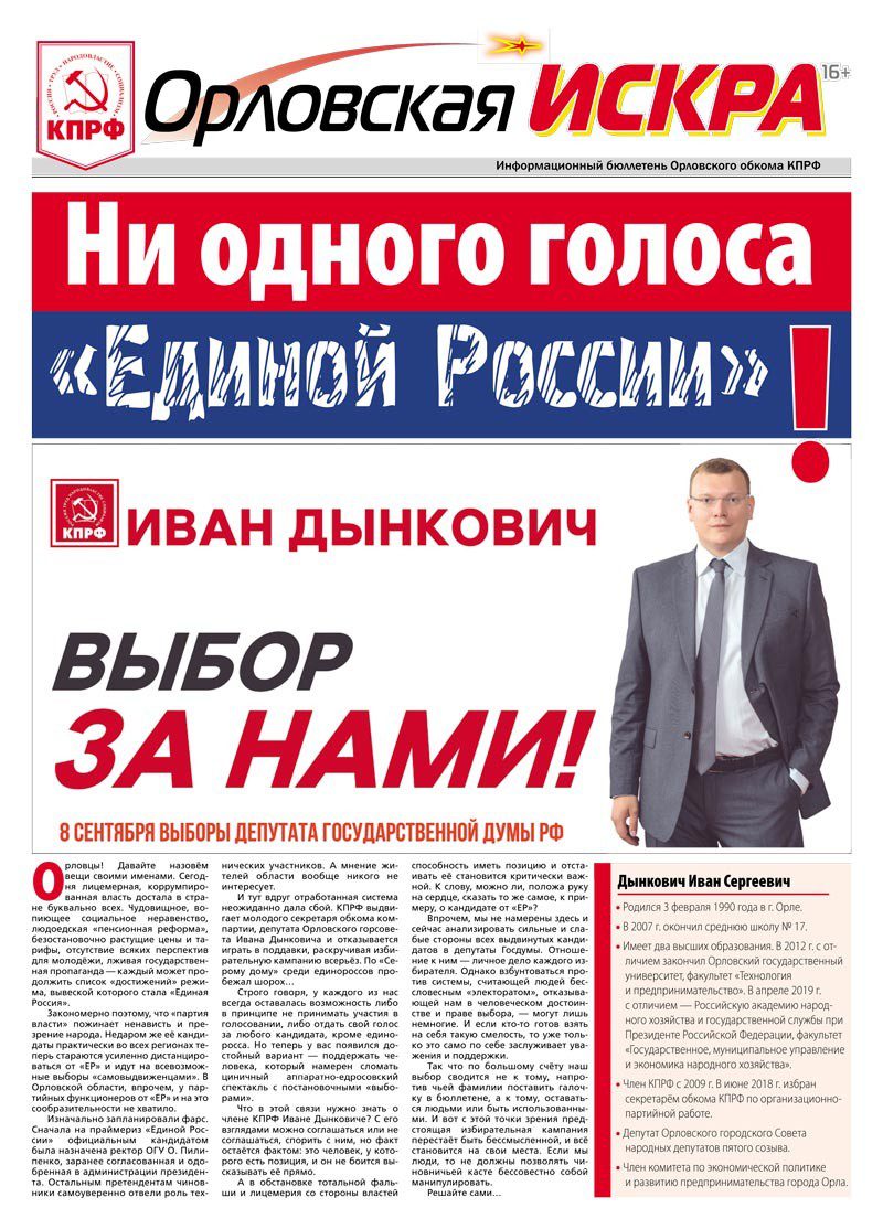 Поводом к публичному «выступлению» стала публикация в «Орловской искре», в которой Иван Дынкович на фоне лозунга «Ни одного голоса за «Единую Россию» обвиняет власть в лицемерии, коррумпированности и отстранении от народа. Напомним, ранее Иван Дынкович шёл под красными знамёнами с призывом «Не надо решать за народ!».