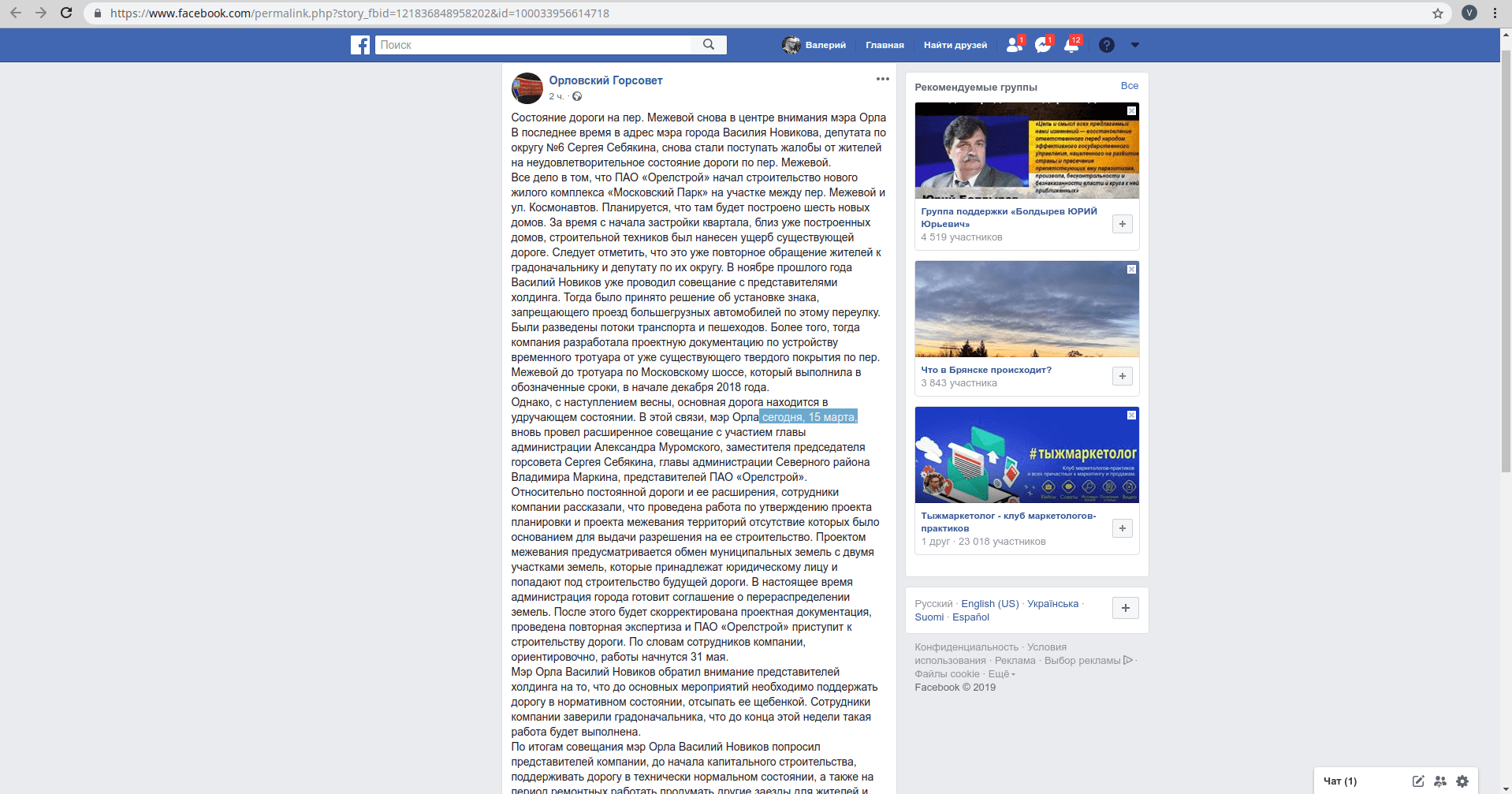 В ноябре прошлого года мэр города уже встречался с представителями Орёлстроя по этому вопросу и тогда было принято решение об установке знака, запрещающего проезд большегрузных автомобилей. Орёлстрой разработал проектную документацию временного тротуара от Московского шоссе по Межевому переулку, который сдали в декабре 2018 года. Однако с приходом весны основная дорога вновь пришла в негодность.