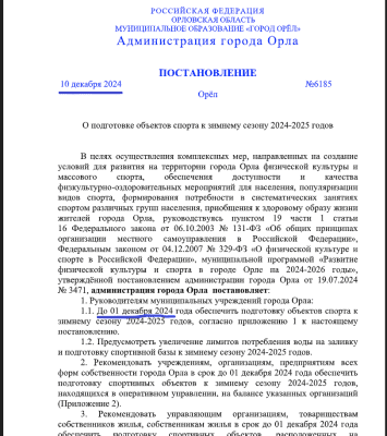 Поразительные бумажные парадоксы случаются в администрации Орла. Мэр Юрий Парахин издал постановление, датируемое 10 декабря 2024 года. В нём речь идёт о подготовке объектов спорта к зимнему сезону 2024-2025 годов. Всё бы ничего, но исполнить постановление должны были ещё к 1 декабря.
