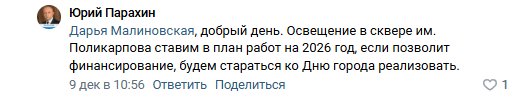 «Освещение в сквере им. Поликарпова ставим в план работ на 2026 год, если позволит финансирование, будем стараться ко Дню города реализовать», — пообещал Парахин.