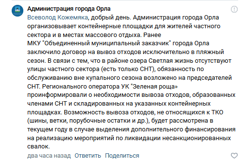 «Администрация города Орла организовывает контейнерные площадки для жителей частного сектора и в местах массового отдыха. Ранее МКУ «Объединённый муниципальный заказчик» города Орла заключило договор на вывоз отходов исключительно в пляжный сезон. В связи с тем, что в районе озера «Светлая жизнь» отсутствуют улицы частного сектора (есть только СНТ), обязанность по обслуживанию вне купального сезона возложена на председателей СНТ. Регионального оператора УК «Зелёная роща» проинформировали о необходимости вывоза отходов, образованных членами СНТ и складированных на указанных контейнерных площадках. Возможность вывоза отходов, не относящихся к ТКО (шины, ветки, порубочные остатки и др.), будет рассмотрена в текущем году в случае выделения дополнительного финансирования на реализацию мероприятий по ликвидации несанкционированных свалок», — пояснили с аккаунта пресс-службы городской администрации.