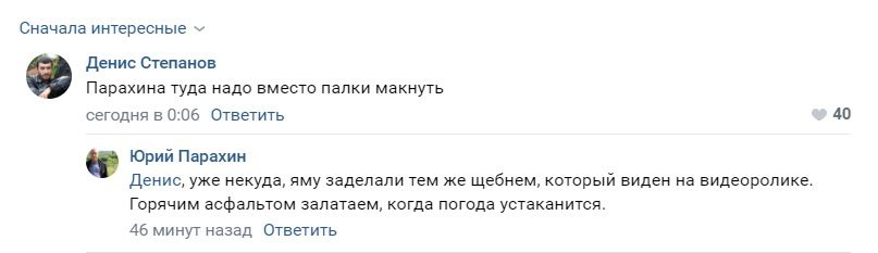 Видео молниеносно разлетелось по всем орловским пабликом, собрав более около 40 тыс. просмотров и 350 лайков. Комментаторы не скупились на иронию: порекомендовали окунуть в яму вместо палки мэра Парахина