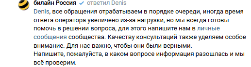 «Хотим помочь разобраться и наладить работу сети. Пожалуйста, напишите нам в личные сообщения номер и адрес, где заметили сложности. Проведём диагностику и всё исправим. Все обращения отрабатываем в порядке очереди, иногда время ответа оператора увеличено из-за нагрузки, но мы всегда готовы помочь в решении вопроса».