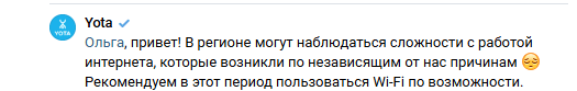 «В регионе могут наблюдаться сложности с работой интернета, которые возникли по независящим от нас причинам. Рекомендуем в этот период пользоваться Wi-Fi по возможности», — пишет Yota