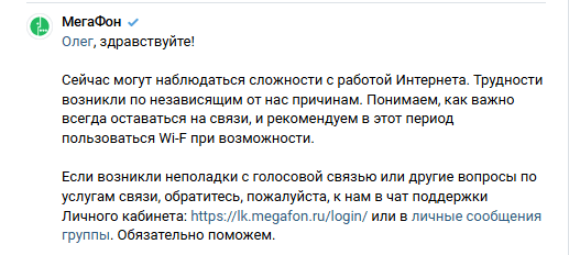 «Сейчас могут наблюдаться сложности с работой Интернета. Трудности возникли по независящим от нас причинам. Понимаем, как важно всегда оставаться на связи, и рекомендуем в этот период пользоваться Wi-Fi при возможности», — указывается в ответе «МегаФона»
