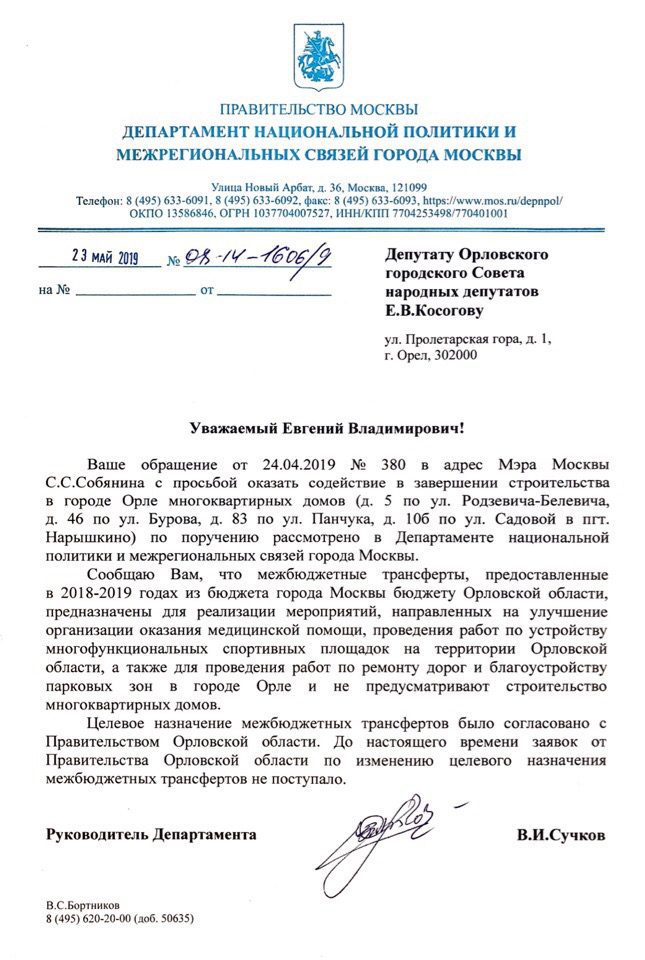 Депутат Орловского горсовета Евгений Косогов направил в мэрию Москвы запрос с предложением изменить целевое назначение направленных столицей 350 миллионов рублей с благоустройства на решение проблемы обманутых дольщиков? Москва ответила, что правительство Орловской области не высказывало в этом заинтересованности. То есть получается, выскажи оно такое желание – Москва могла бы согласиться?