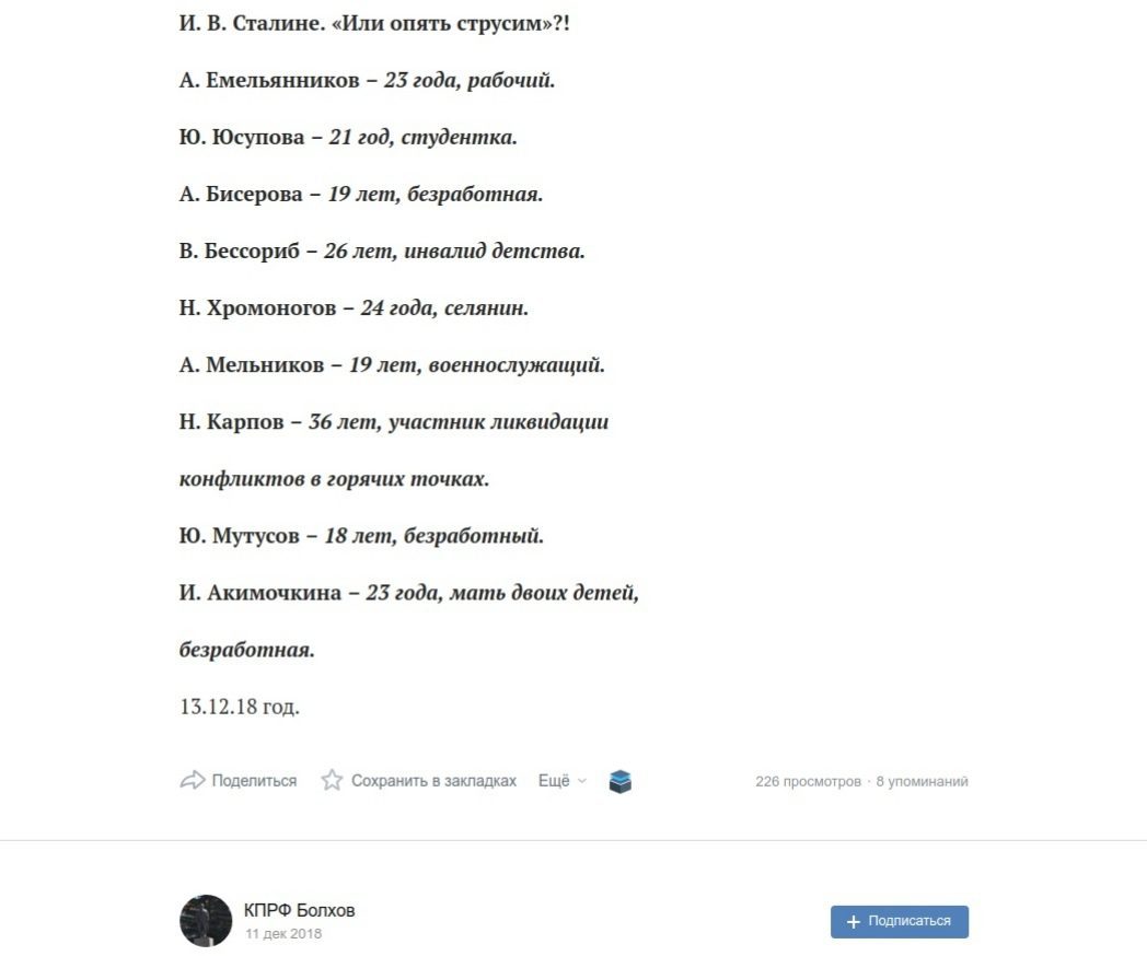 13 декабря в паблике «КПРФ Болхов» был опубликован пост, в котором несколько «молодых коммунистов» своими подписями с расшифровкой поддерживали установку памятнику Иосифу Сталину.