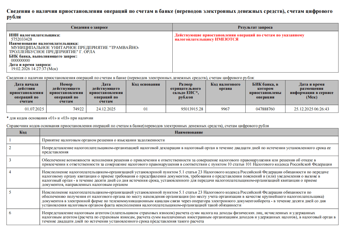 Налоговики частично приостановили операции по счетам МУП «ТТП» Орла