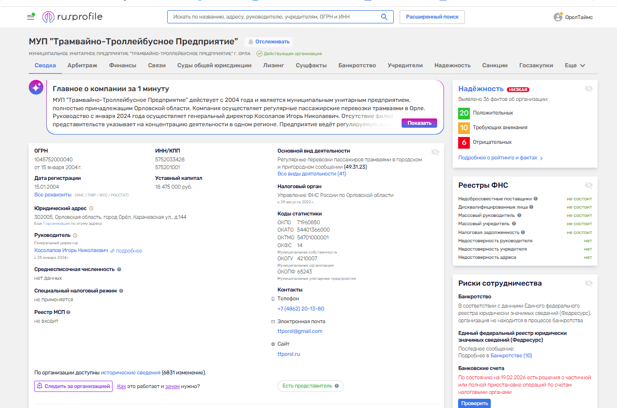 Напомним: как стало известно из озвученного инвестиционного послания губернатора Клычкова, с 2027 года МУП «ТТП» Орла перейдёт на региональный уровень. На данный момент права учредителя осуществляет УМИЗ Орла.