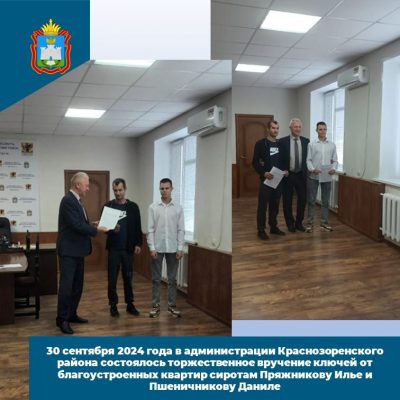 В минувший понедельник, 30 сентября, в администрации Краснозоренского района состоялось торжественное вручение ключей от благоустроенных квартир сиротам Илье Пряжникову и Даниле Пшеничникову. Об этом сообщили в Департаменте ЖКХ, ТЭК и энергосбережения.