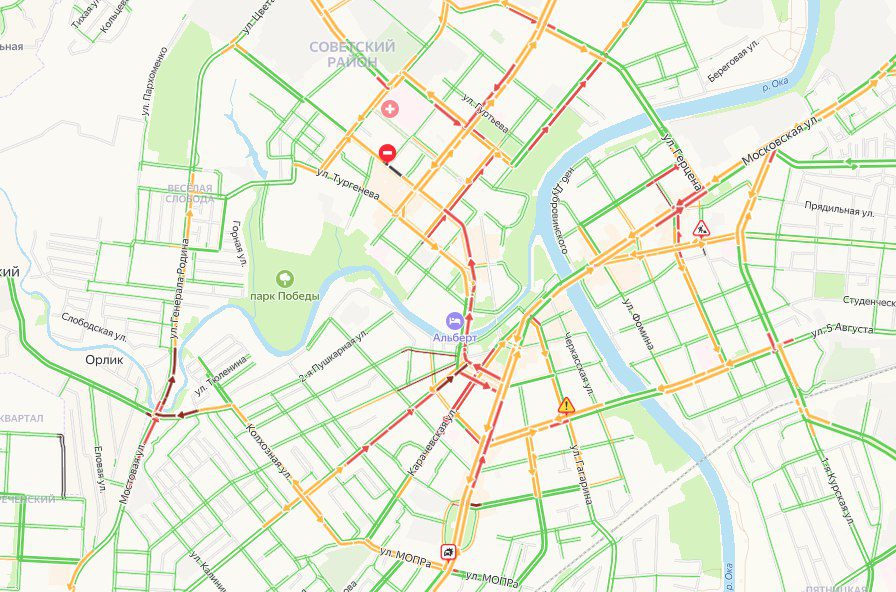 Информация подтверждается и сервисами мониторинга дорожной ситуации. Так, согласно «Яндекс. Картам», пробки сейчас можно наблюдать на улицах Московской, Васильевской, Карачевской, Тургенева, Максима Горького, Октябрьской и Мостовой, а также на Болховском шоссе.