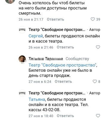 Отметим: ситуация с отсутствием билетов на постановки в Орле длится уже продолжительное время. В соцсетях «Свободного пространства» зрители довольно часто отмечают, что как только появляется афиша, через 5 минут билетов ни на одну постановку в онлайн уже нет. Руководство отправляет орловцев в кассы, однако и тут жителей, по их словам, ждёт разочарование. Билетов нет.