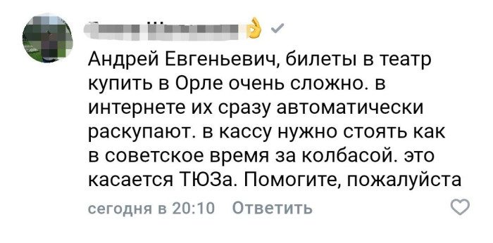 «Андрей Евгеньевич, билеты в театр купить в Орле очень сложно. В интернете их сразу автоматически раскупают. В кассу нужно стоять, как в советское время за колбасой. Это касается и ТЮЗа. Помогите, пожалуйста», — обратилась к региональном главе орловчанка.