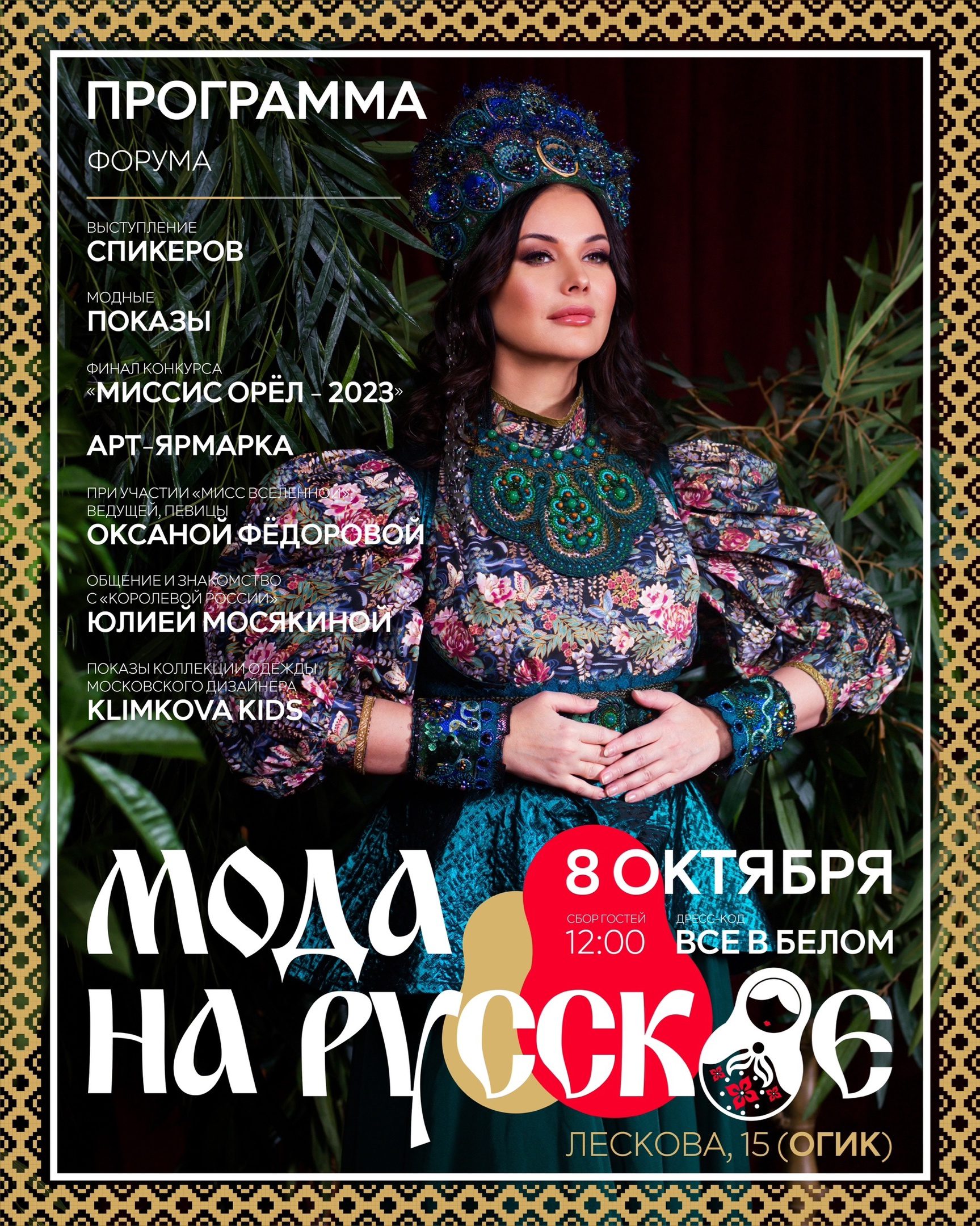 8 октября в Орле, в Орловском государственном институте культуры пройдёт Форум красоты и стиля «Мода на Русское». В нём примет участие «Мисс Россия» 2001 года известная телеведущая Оксана Фёдорова. Форум соберёт представителей модных брендов, стилистов и дизайнеров.