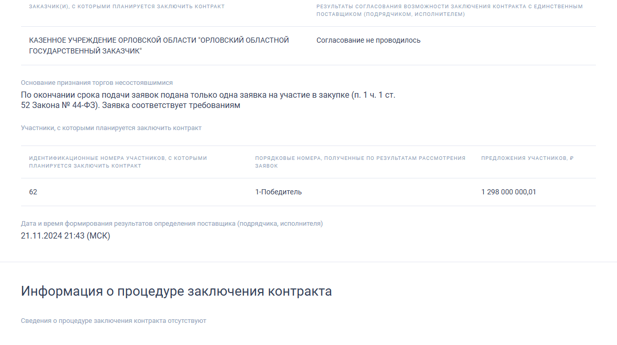 Сделано это было ещё 21 ноября 2024 года. На торги была подана всего одна заявка, которая и была признана победителем. Предложение участника составило 1,298 млрд рублей, что соответствует начальной цене.