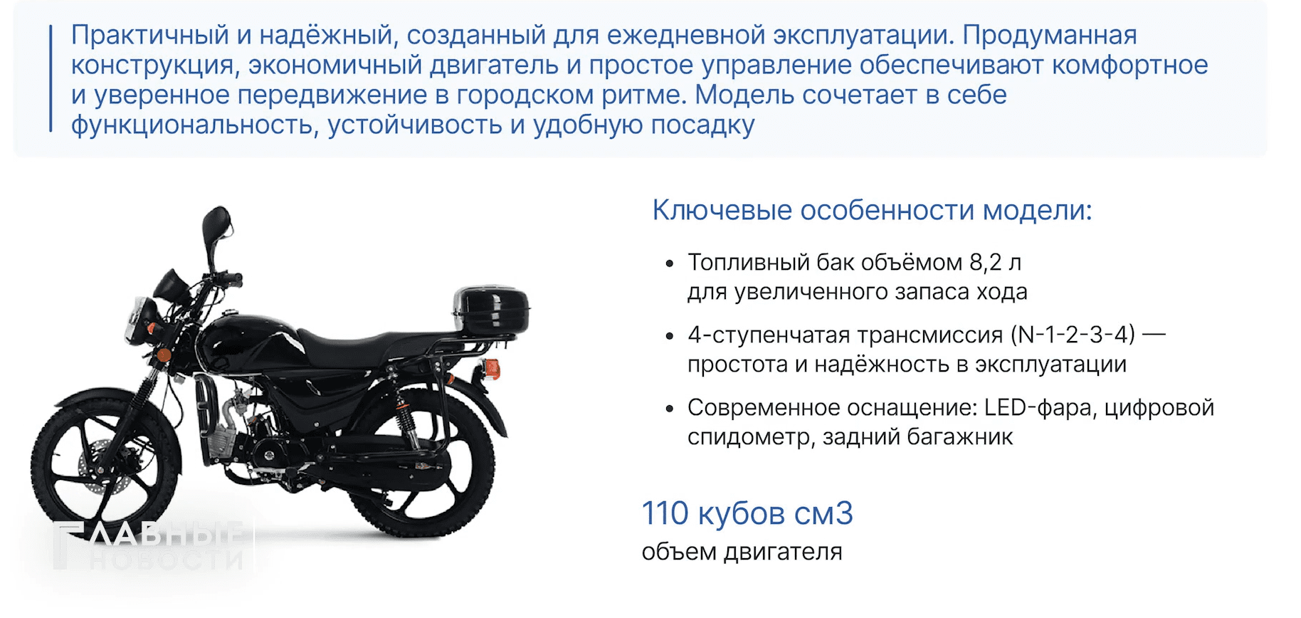 Первые двухколёсные «орлы» должны выпустить в ближайшие дни. Это будет универсальная модель мотоцикла для езды по городу. Объём двигателя составит 110 кубов см3, топливный бак объёмом 8,2 литра.