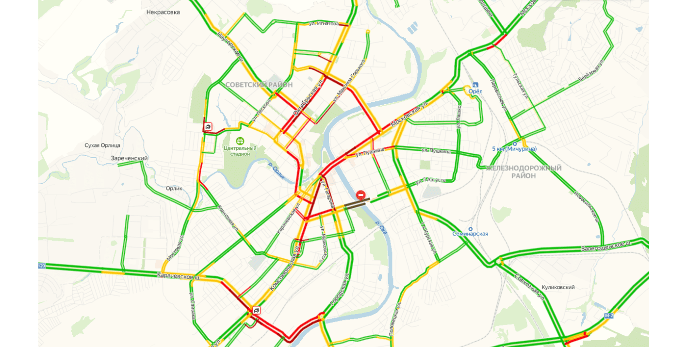 Классически «побагровел» Красный мост, ул. Октябрьская со стороны Администрации Орловской области. Почти не проехать в районе городского парка по ул. Максима Горького. Всё плохо и возле автовокзала: от Маслозаводского переулка до Карачевского шоссе. С трудом можно проехать и ул. 60-летия Октября, «Герценский» мост.