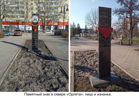 Два десятка лет этот сквер не назывался никак. Сквер и сквер… А 28 мая 2002 года, в ознаменование 80-й годовщины со дня основания пионерии, по ходатайству областного совета Орловской пионерской организации «Орлята» безымянному скверу было присвоено имя этой самой организации. Если попросту – сквер «Орлята». Тогда же в «окнах» стелы появилась соответствующая символика: с одной стороны – логотип пионерской организации, с другой – эмблема военизированной пионерской игры «Зарница».