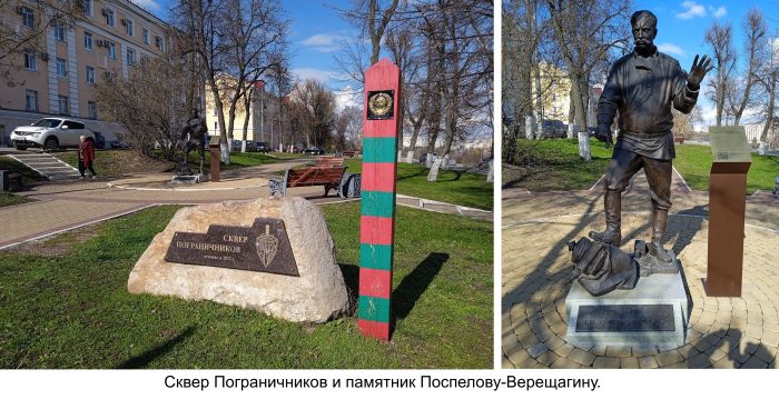 Прогулка вдоль здания городской администрации в сторону парка приведёт нас в сквер Пограничников. Почему именно пограничников и почему именно здесь – бог весть. Хорошо, конечно, что защитники рубежей Родины не забыты, но разве меньшего уважения заслуживают, например, подводники или ракетчики? Ладно, есть – и хорошо. Смысловым центром сквера является бронзовая скульптура, посвящённая офицеру пограничной стражи Российской империи и пограничных войск СССР, уроженцу Орла Михаилу Поспелову. Считается, что именно он послужил прототипом Павла Верещагина, героя культового советского фильма «Белое солнце пустыни». (Помните? «Верещагин! Уходи с баркаса! Взорвёшься!!!») Любопытный нюанс: отсутствие явного портретного сходства с актёром Павлом Луспекаевым, сыгравшим Верещагина в фильме, и наличие на гимнастёрке погон, коих расхристанный киногерой не носил, позволяют считать это изваяние памятником пограничнику Поспелову. Но в то же время правая нога бронзового героя попирает мешок с контрабандой, а на постаменте процитирована крылатая фраза Верещагина: «Я мзду не беру, мне за державу обидно», что в совокупности вполне естественно: Павел Артемьевич – не пограничник, а таможенник.