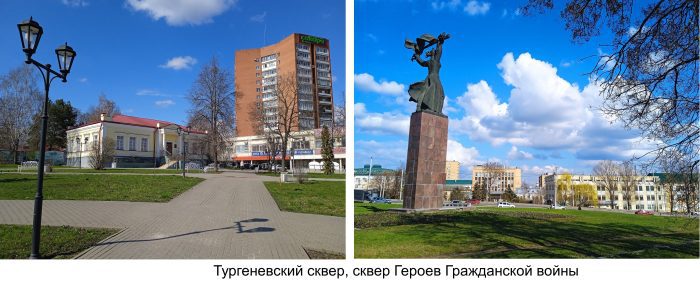 Прежде чем отправиться вниз по Ленинской, сделаем небольшой крюк, дойдём до музея Тургенева. Квадрат, образованный улицами 7-го Ноября, Горького, Тургеневской и Георгиевским переулком, официально называется «Литературным кварталом». Но квартал кварталом, а перед входом в музей Ивана Сергеевича мы видим несомненный сквер – благоустроенный и с вполне внятно очерченными границами. Здесь начинается непонятное: то ли имеет он официальное наименование «Тургеневский сквер», как утверждают, например, Яндекс-карты, то ли нет. Дело в том, что когда-то «Сквером им. Тургенева» называлось пространство вокруг памятника писателю на высоком берегу Оки у городского парка. В 2021 году, в рамках инициированного администрацией Орла «приведения наименований элементов планировочной структуры и улично-дорожной сети города к единому образцу» территории вернули историческое название: сквер «Тургеневский бережок».