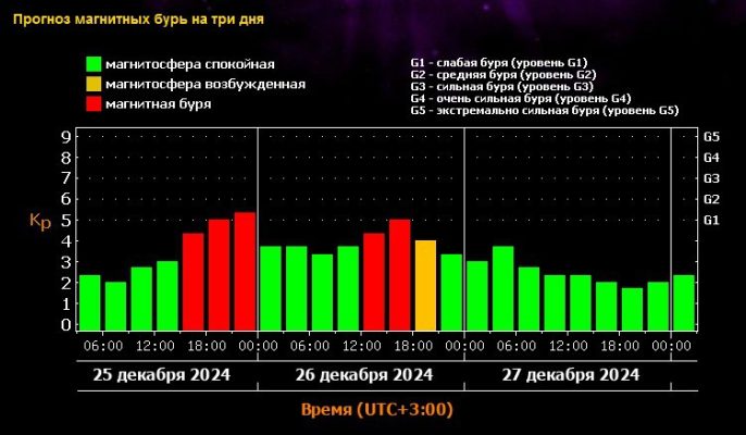 Более того, слабая магнитная буря класса G1, ожидается и в послеполуденные часы 26 декабря из-за возможных остаточных эффектов выброса корональной массы в сочетании с возможным потоком из корональной дыры.