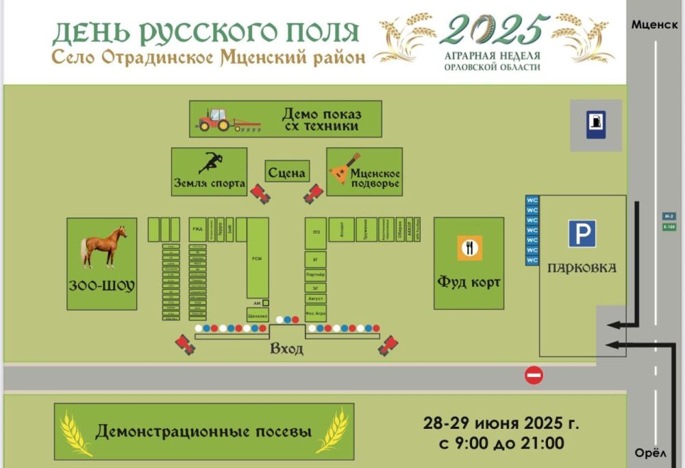 28 июня все желающие приглашаются в село Отрадинском Мценского района на традиционный «День русского поля». Здесь развернутся экспозиции поставщиков сельскохозяйственной техники, минеральных удобрений, научных и образовательных организаций. Участники также смогут посетить выставку-дегустацию «Сделано в России. Выбираем орловское!».