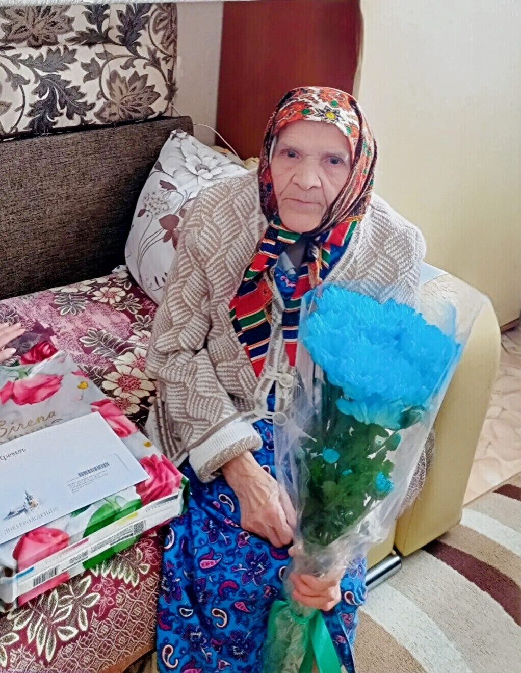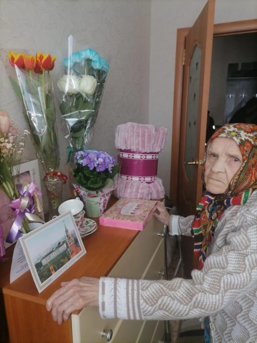 Поздравить Антонину Филину с юбилеем приехала директор центра соцобслуживания населения Мценского района Ольга Калинина. Орловчанке подарили цветы и памятные подарки.
