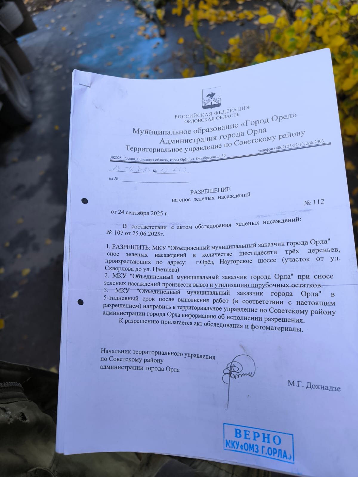 Судя по всему, речь идёт о сносе 63 деревьев вдоль Наугорского шоссе. Глава Советского района Орла Мераб Дохнадзе подписал соответствующее разрешение 24 сентября 2025 года, ссылаясь на акт обследования зелёных насаждений. Сносом деревьев занимается МКУ «ОМЗ г.Орла».