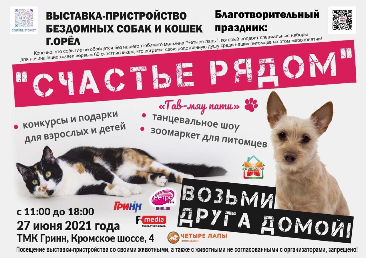 27 июня в Орле пройдёт благотворительная выставка-пристройство бездомных животных «Счастье рядом»!