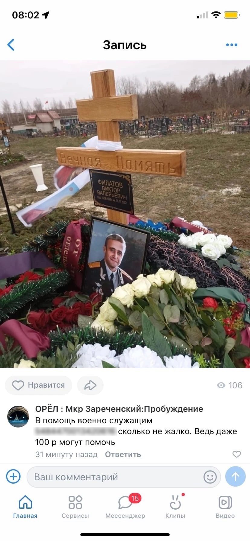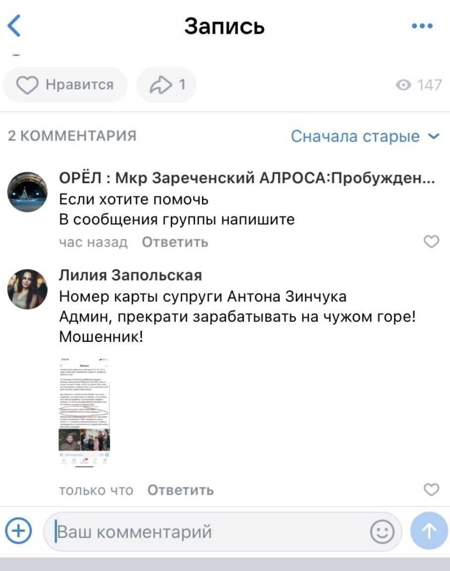 Несколько дней назад в данном паблике появилась публикация с призывом материально помочь супруге погибшего в ходе СВО медика Антона Зинчука. Вот только номер карты, который указал администратор сообщества, оказался совершенно не тем, который опубликовали общественные организации Орла и активисты, в том числе, Сергей Почтарёв. На данный момент пост исправлен, номера карты нет, а админ предлагает писать в личные сообщения сообщества. Однако в сети сохранился оригинал сообщения.