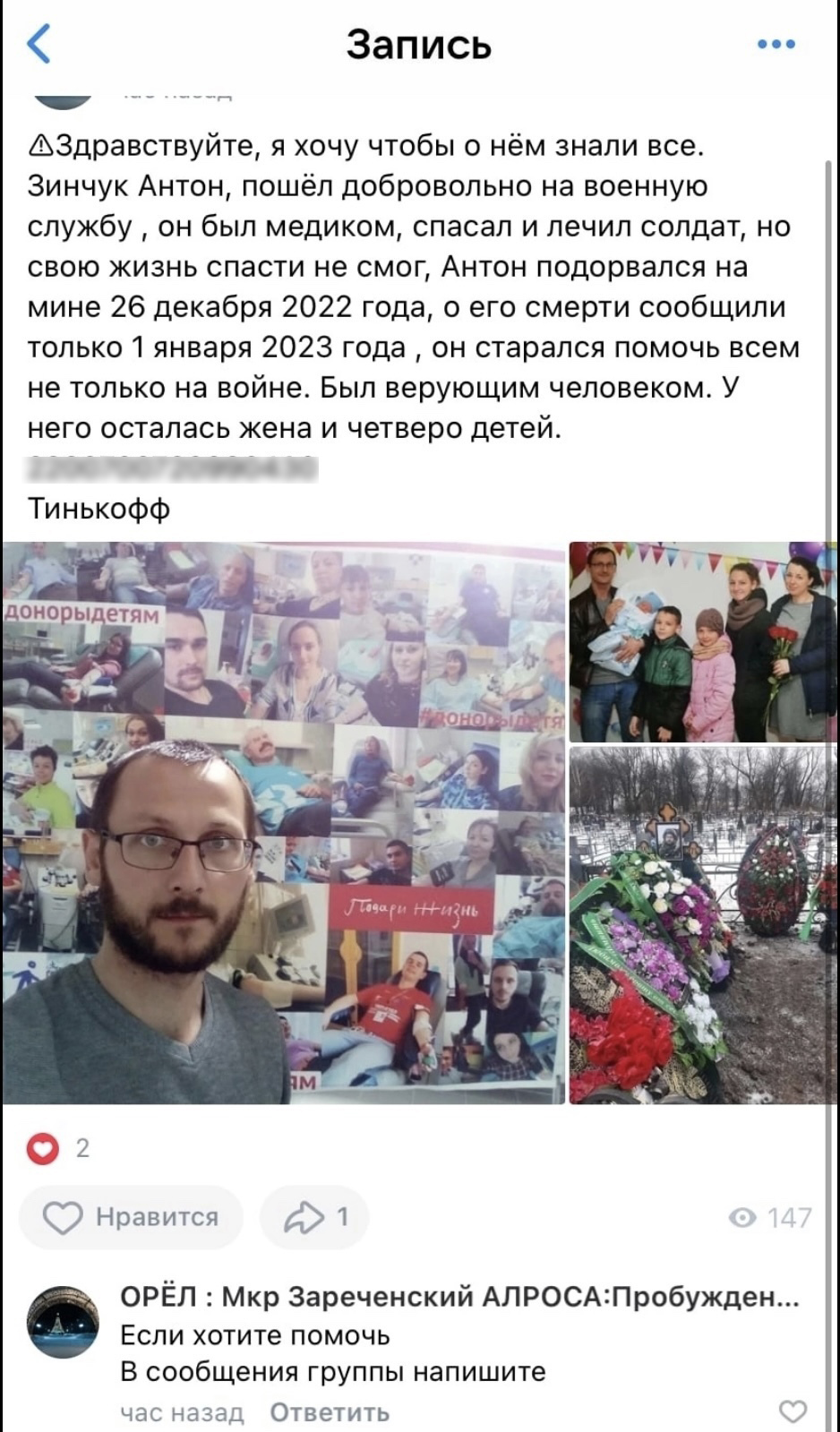 «Здравствуйте, я хочу чтобы о нём знали все. Зинчук Антон, пошёл добровольно на военную службу, он был медиком, спасал и лечил солдат, но свою жизнь спасти не смог, Антон подорвался на мине 26 декабря 2022 года, о его смерти сообщили только 1 января 2023 года , он старался помочь всем не только на войне. Был верующим человеком. У него осталась жена и четверо детей», — сказано в посте.