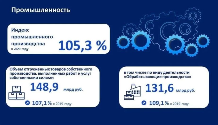 По сравнению с 2019 годом объём отгруженных товаров собственного производства, выполненных работ и услуг составил 148,9 млрд рублей. Рост составил 7,1%.