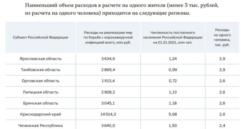 Например, в ТОП-10 регионов, которые один из федеральных telegram-каналов назвал «С заботой о людях в борьбе с ковидом», попали Мурманская и Московская области, Камчатский край, ЯНАО и т. д. Во всех этих 10 регионах ковидные расходы в расчёте на одного жителя составляют более 10 тыс рублей.