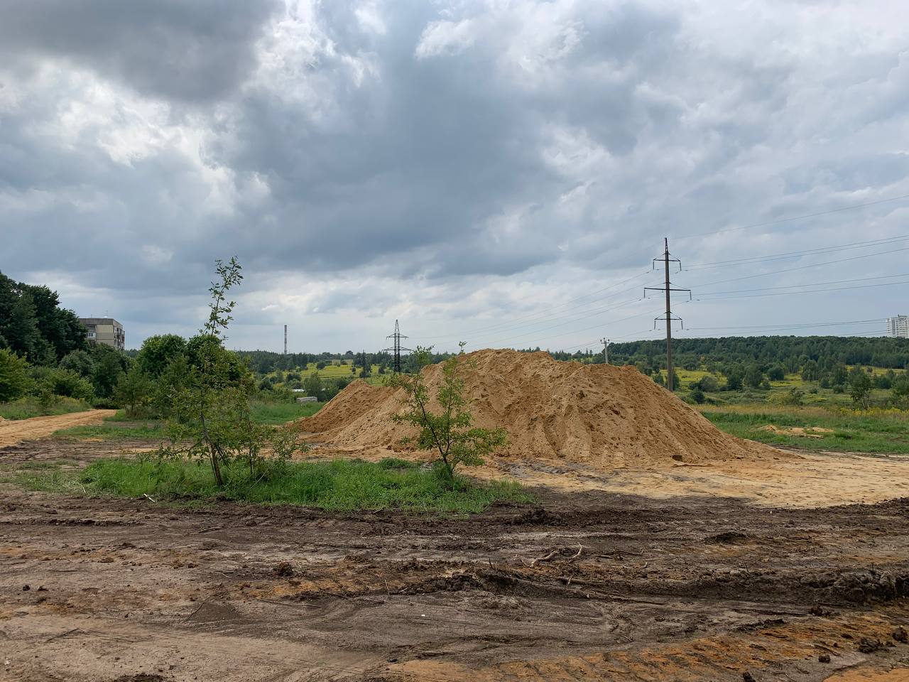 На месте строительства действительно лежит две большие кучи песка. Одна из которых уже постепенно превращается в дорогу.