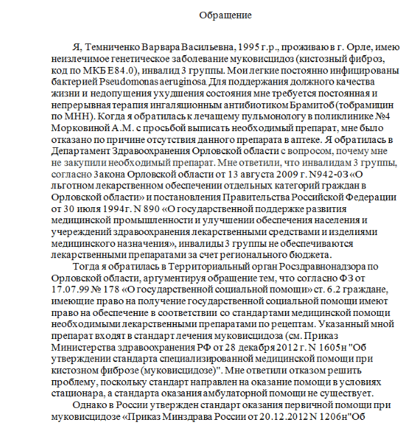 – По федеральному закону я имею право получить антибиотик, поскольку он входит в стандарт лечения муковисцидоза. Но по постановлению Правительства РФ 1994 года, которыми руководствуются чиновники, сказано, что инвалиды 1 и 2 группы обеспечиваются за счёт регионального бюджета, а 3 группа получает лекарства по положенным федеральным 860 рублей.