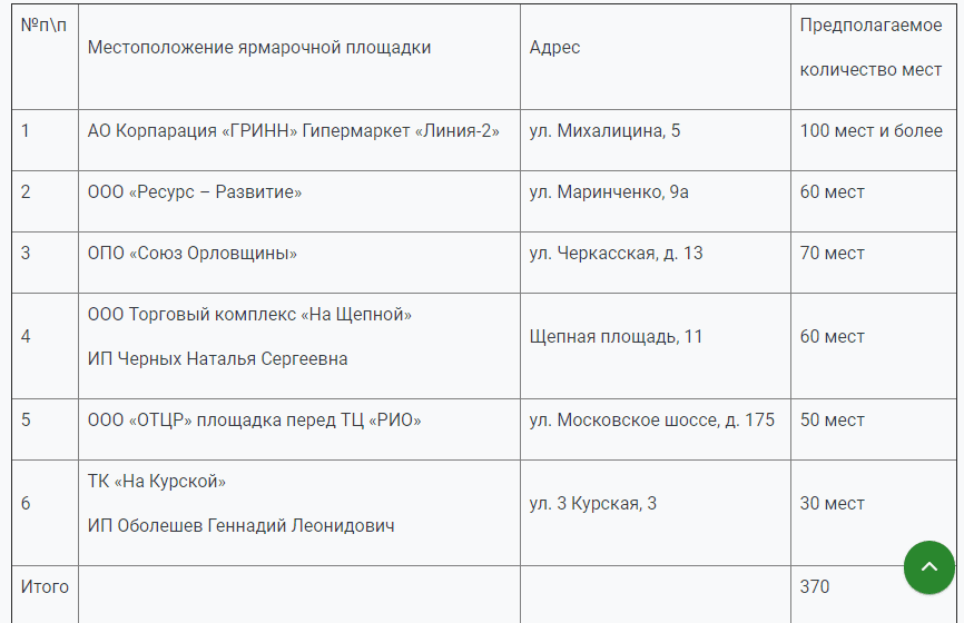 В будущем также рассмотрят вопрос о выделении мест для осуществления ярмарочной торговли на Кромском шоссе, 23 в гипермаркете «Линия-1», на ул. Лескова, 19 б в крытом рынке и на Комсомольской, 287 в ООО «Золотой век».