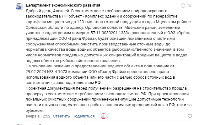 «В соответствии с требованием природоохранного законодательства РФ объект «Комплекс зданий и сооружений по переработке картофеля» мощностью до 120 тыс. тонн готовой продукции в год в Мценском районе Орловской области, принадлежащий ООО «Гранд Фрайз», будет оснащён локальными очистными сооружениями, способными очистить производственные сточные воды до норматива качества воды водных объектов рыбохозяйственного значения, в том числе нормативов предельно допустимых концентраций вредных веществ. Проектная документация перед получением разрешения на строительство прошла проверку. При проектировании локальных очистных сооружений применены наилучшие допустимые технологии очистки сточных вод», — пояснили в официальном сообществе ОрелТаймс ВКонтакте с аккаунта пресс-службы профильного департамента.