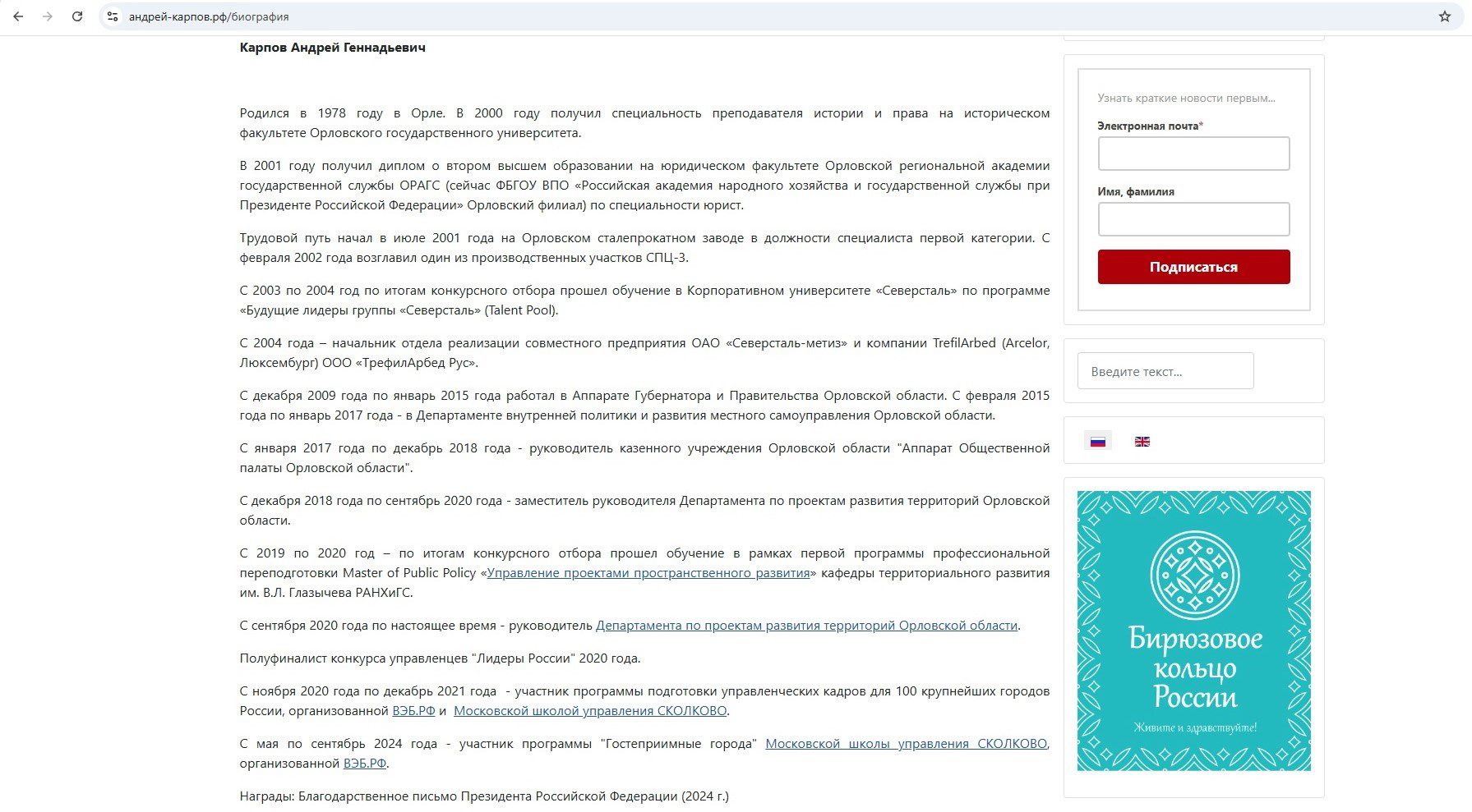 Зато глава департамента успевает обновлять свой личный сайт. Да, Андрей Карпов несколько лет назад создал себе страницу. Например, там есть биография «хозяина» «Бирюзового кольца», в которой указано, что он в 2024 году получил благодарность президента России, а ещё стал участником Московской школы «Сколково»…