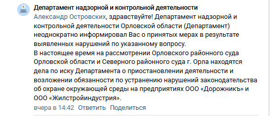 «В настоящее время на рассмотрении Орловского районного суда Орловской области и Северного районного суда Орла находятся дела по иску Департамента о приостановлении деятельности и возложении обязанности по устранению нарушений законодательства об охране окружающей среды на предприятиях ООО «Дорожникъ» и ООО «Жилстройиндустрия»», — указывается в ответе профильного ведомства.
