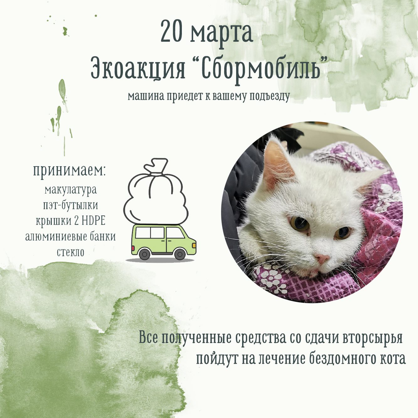 Каждый раз деньги, полученные от переработки во время акции идут на благотворительность: например, на помощь приютам с бездомными животными, больным детям или перечисляют в фонды. Деньги с акции 20 марта пойдут на лечение бездомного кота, которого нашли сами экоактивисты в районе Алроса. У кота жуткие переломы и ушибы. Скорее всего, он попал под машину. Но шансы жить у кота есть. Так сказали врачи в ветклинике, куда отвезли пушистого пострадавшего волонтёры. Сейчас он наблюдается в стационаре и его ожидает ряд сложных операций. Деньги пойдут на оплату лечения кота, операции, восстановление и наблюдение в стационаре.