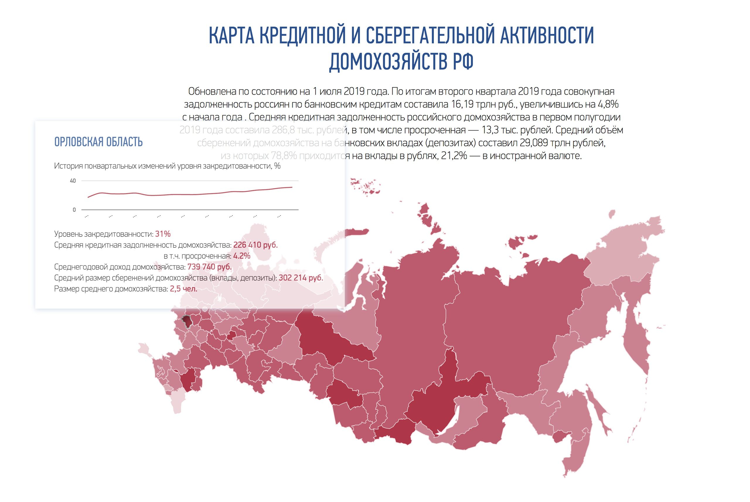 Орловская область вошла в четвёртую (из 5) группу регионов, в которых уровень закредитованности близок к критической отметке. По данным Карты, уровень закредитованности орловских семей, рассчитываемый как отношение среднего объёма задолженности к среднему годовому доходу, составил 31%. Это означает, что обычная орловская семья отдаёт треть от годового дохода на погашение банковских кредитов. Для сравнения: год назад средний уровень закредитованности составлял 24%. Средняя кредитная задолженность на орловскую семью, состоящую из 2 человек, по мнению экспертов проекта ОНФ, составила около 226 тысячи рублей.