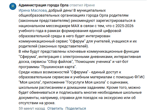 С аккаунта пресс-службы городской администрации сообщили, что «в муниципальных общеобразовательных организациях города Орла родителям (законным представителям) рекомендуют зарегистрироваться в национальном мессенджере MAX «Среди новых возможностей «Сферума» — единый доступ к образовательным сервисам и учебным материалам с помощью ФГИС «Моя школа», приложение «Госуслуги Моя школа» с оценками, школьным расписанием и домашним заданием. Кроме того, можно будет обмениваться и подписывать многие необходимые школьные документы, например, справки для поездок на экскурсию или об отсутствии на уроке», — добавили в Администрации Орла.