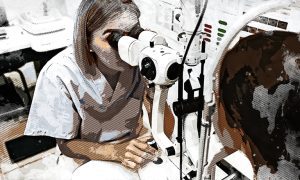 Женщине провели лазерную иридэктомию глаза. Это микрохирургическая процедура, при которой лазером создаётся маленькое отверстие в радужной оболочке, чтобы восстановить нормальную циркуляцию внутриглазной жидкости.